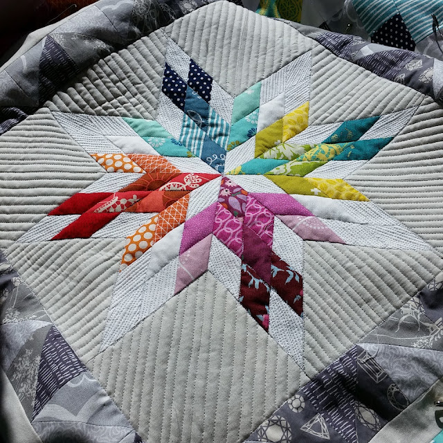 A few weeks ago, I started quilting my Aviatrix Medallion and then everything came to a stand still when I got sick. I started feeling much better this week though, and I've gotten back into quilting with a vengeance - and I have progress to share!! It's nice to have energy again - this quilt weighs a tonne with all the seams and due to the sheer size of it (80" square), so the last thing I felt like doing last week was wrestling with this ;o)